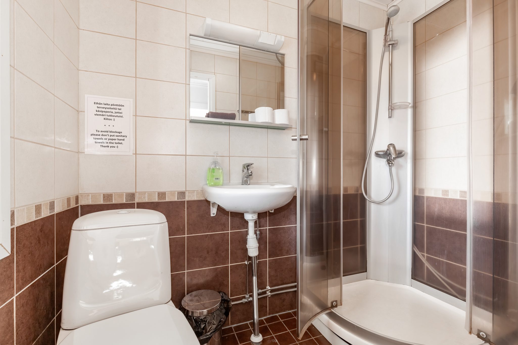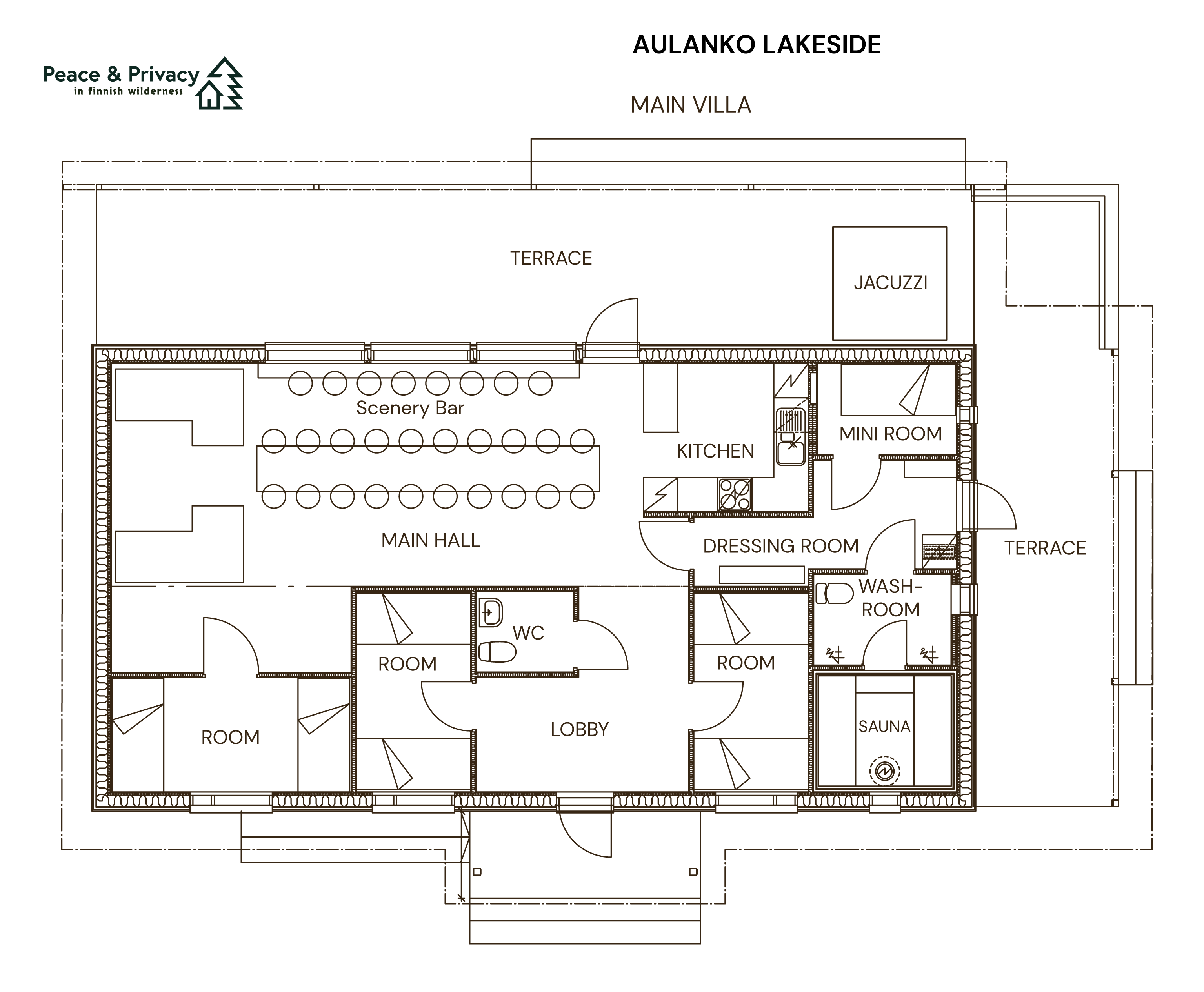 SAUNAS, SHOWERS, AND TOILETS: The electric sauna at the end of the Main Villa can accommodate about 8 bathers at a time. There is only a short distance from the sauna terrace to Lake Aulangonjärvi, the electric hot tub on the terrace, or the hot tub on the lakeside sauna terrace. The sauna section also has 2 showers and a toilet. Additionally, there’s a separate toilet in the villa’s lounge. In the Little Villa, the toilet and shower area is conveniently located as an extension of the entrance hall.