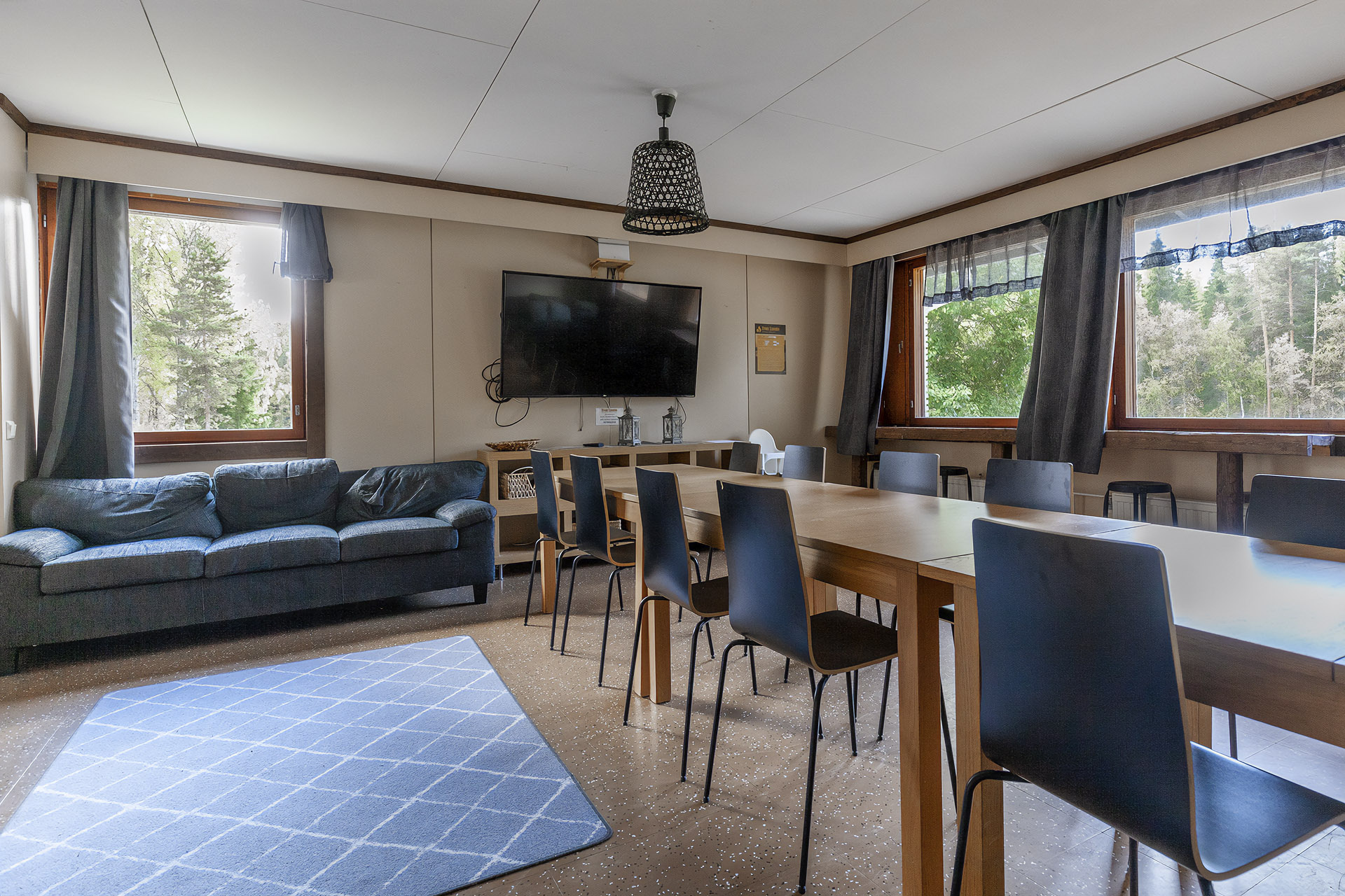 MAIN HALLS AND LOUNGE/CONFERENCE SPACES: The approximately 50-square-metre main hall on the upper floor, along with the open kitchen, offers conference, lounge, and dining space for about 30 people with its sofas and dining tables. The upper floor main hall has a 65-inch flat-screen TV that can be used as a presentation screen for conferences. We also provide a large whiteboard for our conference guests.