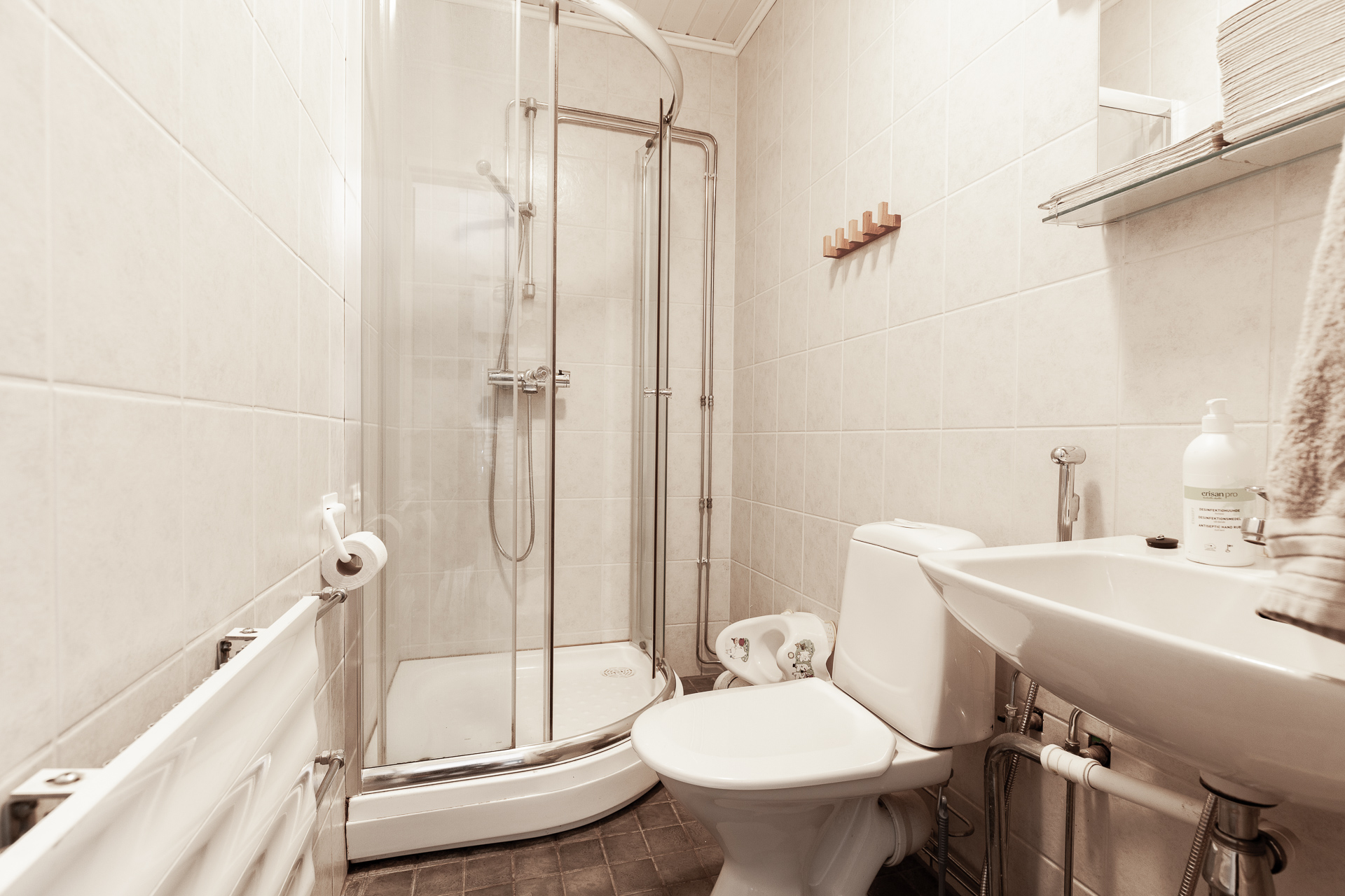 There are 4 showers in the two shower rooms within the sauna area, plus one more in the sauna. There are a total of 5 toilets. On the upper floor, there is an additional shower in both of the toilets.