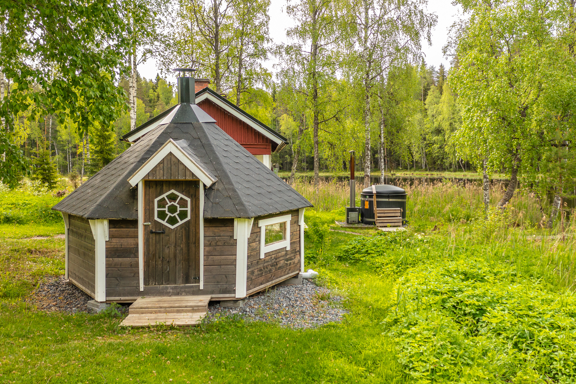 BEACH SAUNA: The wood-heated beach sauna located by Pond Kaitalammi is equipped with its own hot tub, running hot water, and a shower. Behind the sauna, there is a fireplace for barbecuing.