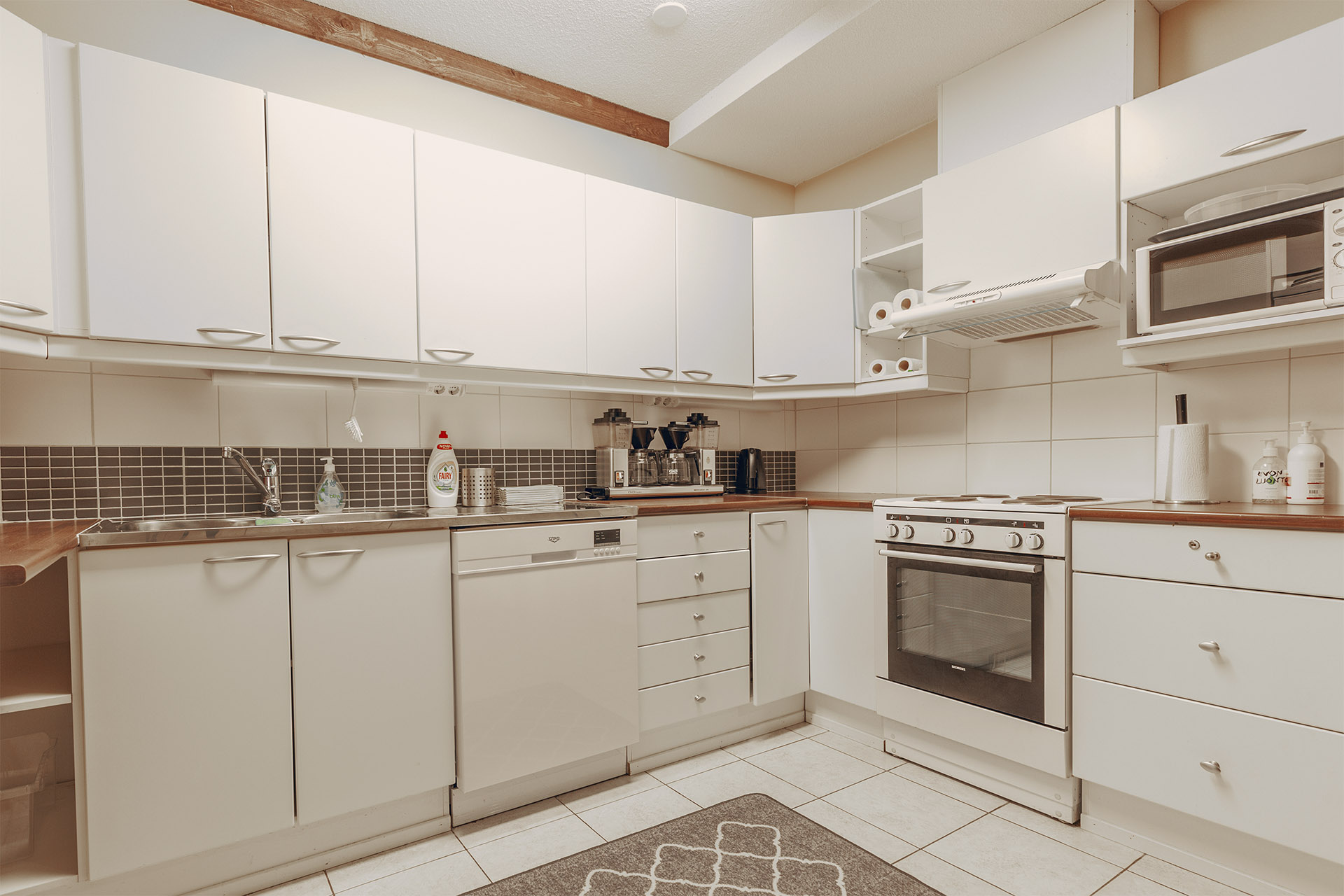 KITCHEN: The kitchen is equipped with tableware for at least 20 guests, an electric stove and oven, a large refrigerator, a freezer, a dishwasher, a microwave, a Moccamaster coffee maker, an electric kettle, and a toaster.