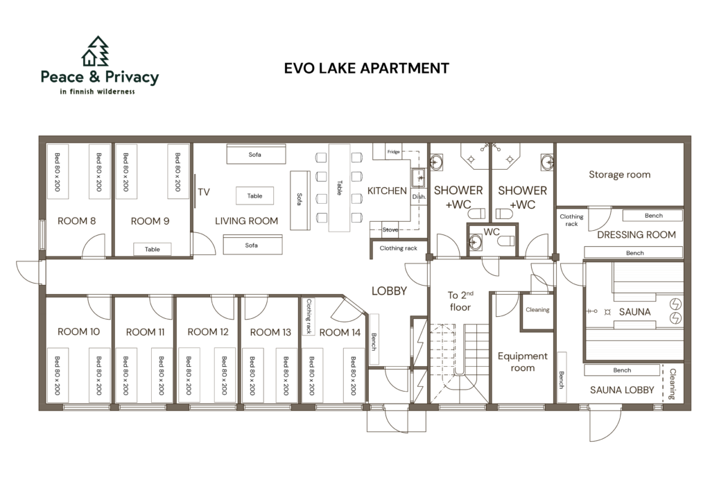 The Evo Lake Apartment is located on the lower floor of the Evo Grand Villa. It accommodates up to 17 vacationers, partygoers, or conference attendees in its bedrooms – perfect for those who want to recharge their batteries by a mystical forest lake or hold conferences in the scenic surroundings of small Lake Kaitalammi.