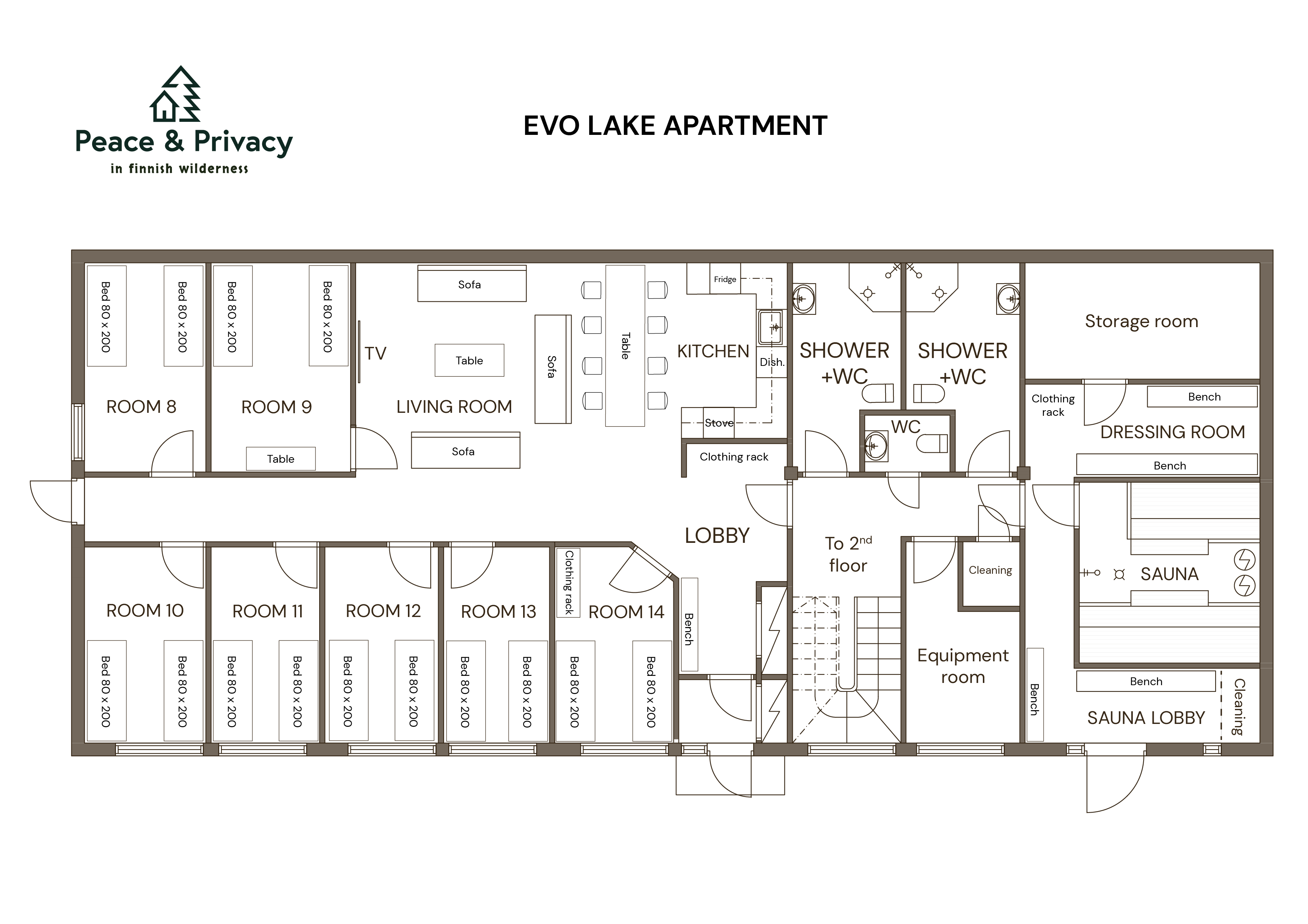 GENERAL INFORMATION: The Evo Lake Apartment, located in Evo, Hämeenlinna, is an accommodation and conference villa concept for up to 17 overnight guests, suitable for both businesses and private customers alike. The Lake Apartment is a separate 210-square-metre apartment located on the lower floor of the Evo Grand Villa. The Lake Apartment can be booked as its own standalone destination or as part of the Evo Grand Villa and the entire Evo Peace area.