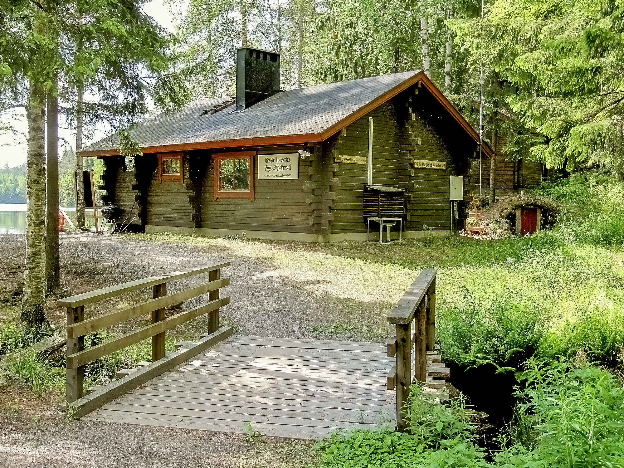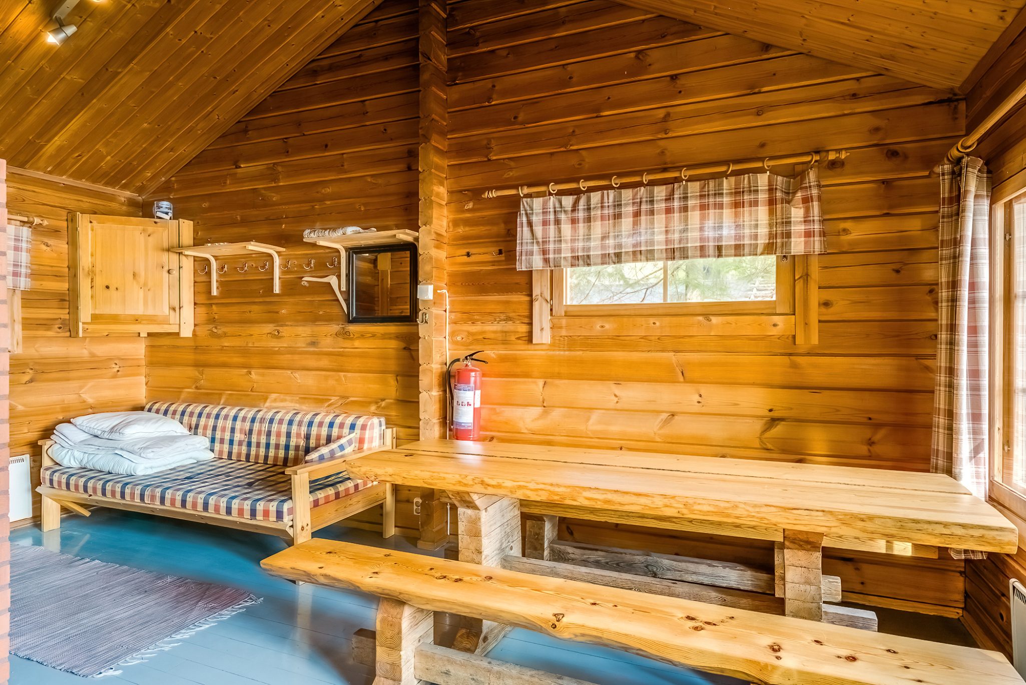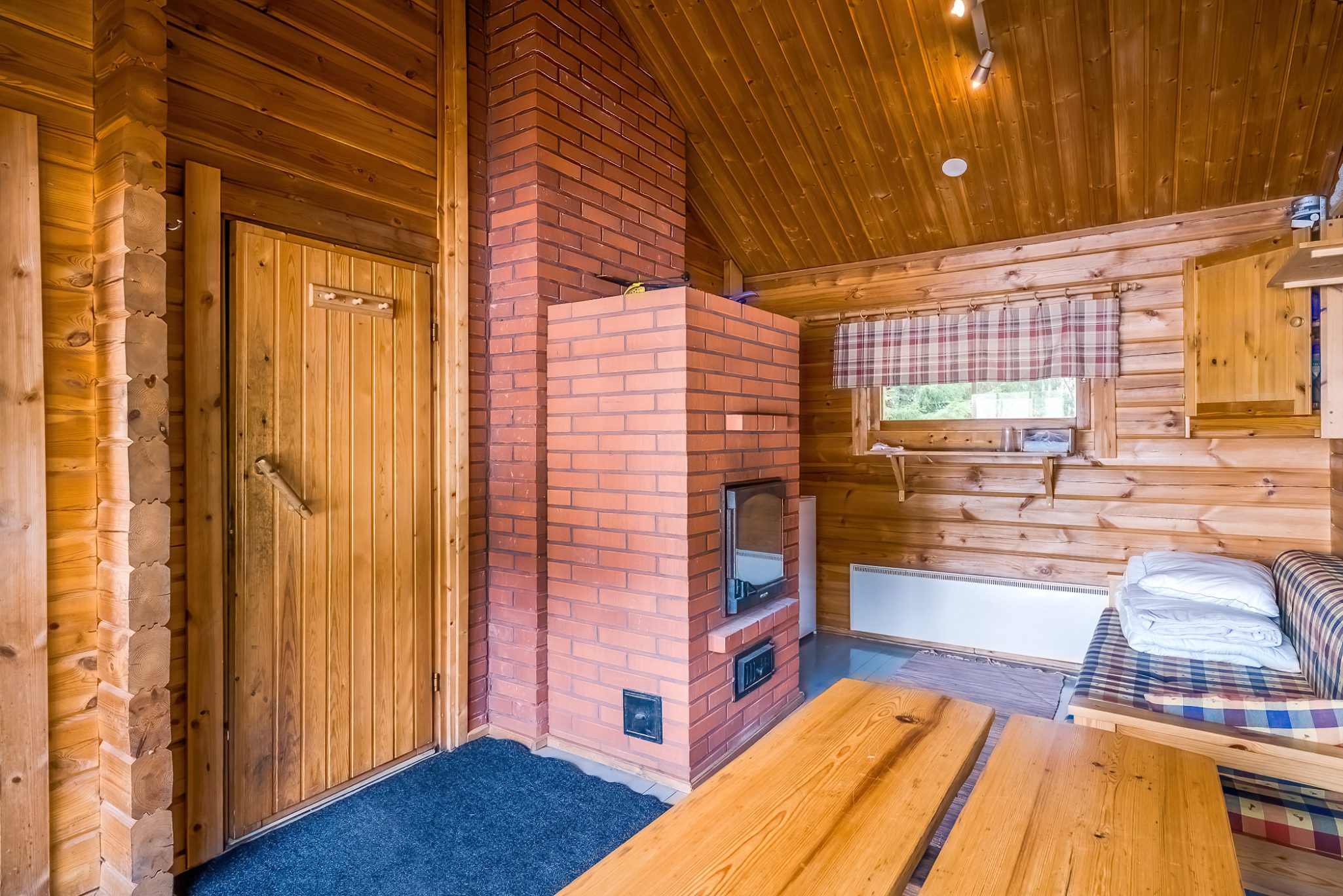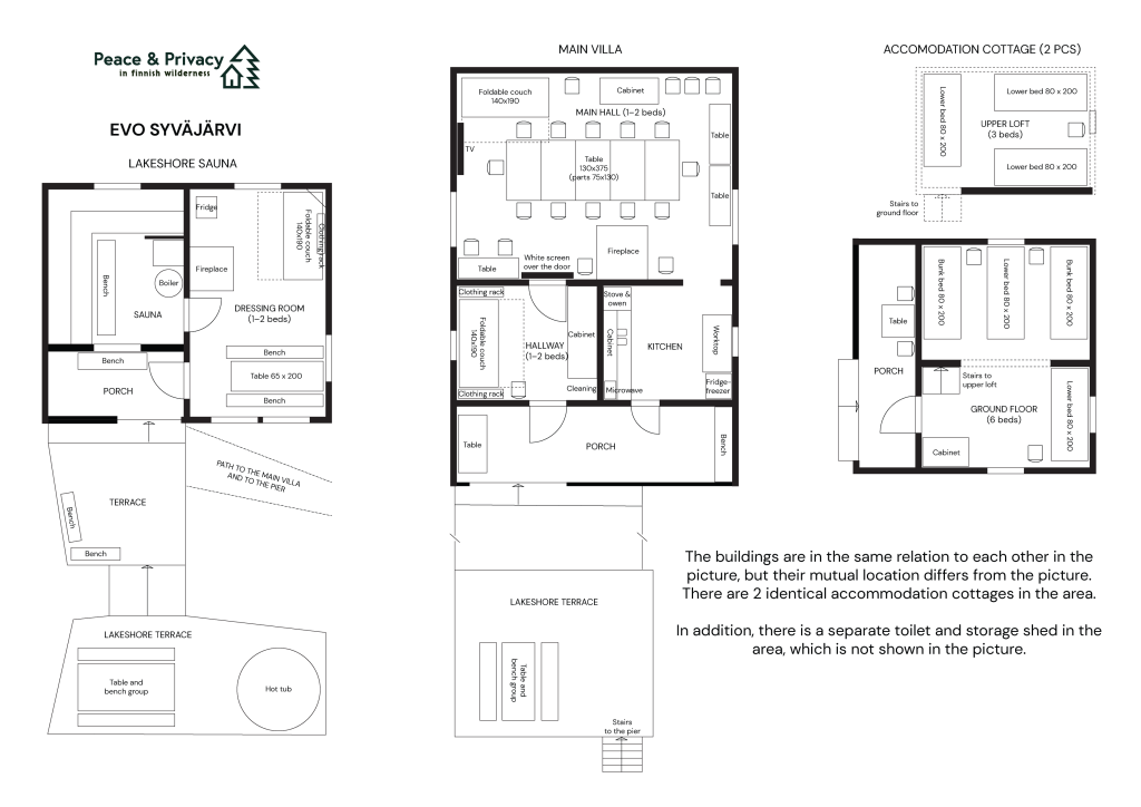 SAUNA AND TOILETS: The wood-heated lakeside sauna can accommodate up to 10 guests on its benches. Cold running well water is available from the tap, and you can heat the washing water using the wood-heated stove’s water heater. Two dry toilets are located in a separate building between the main building and the accommodation buildings.