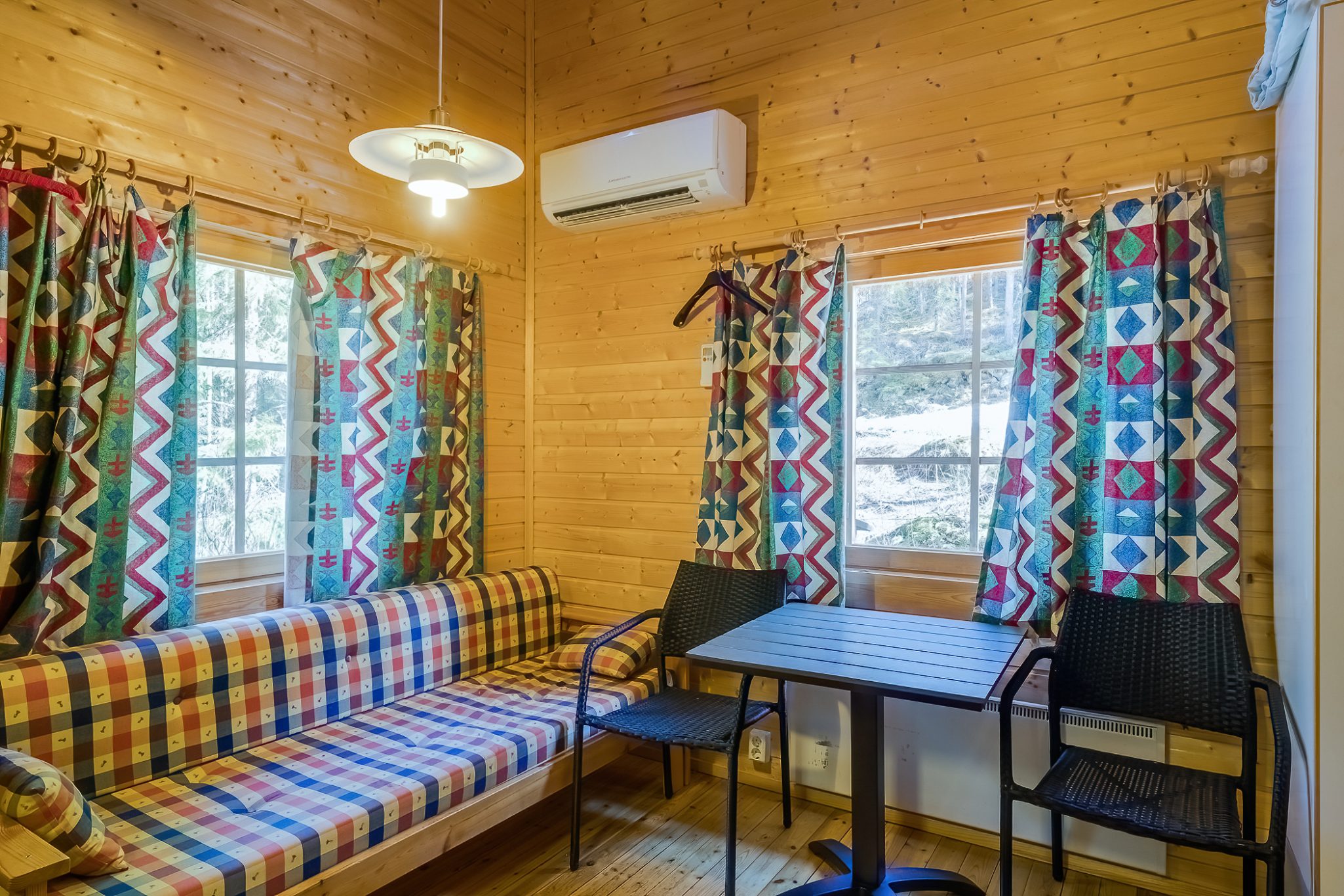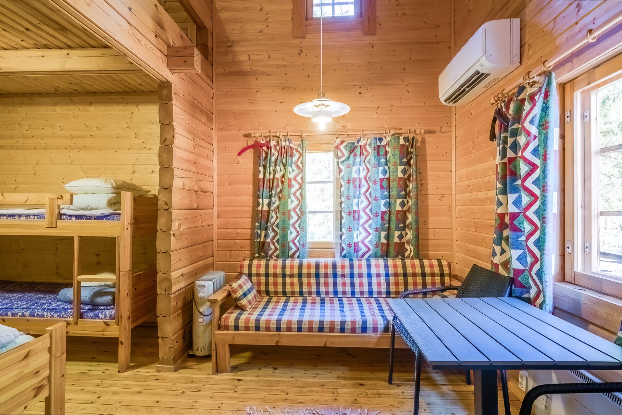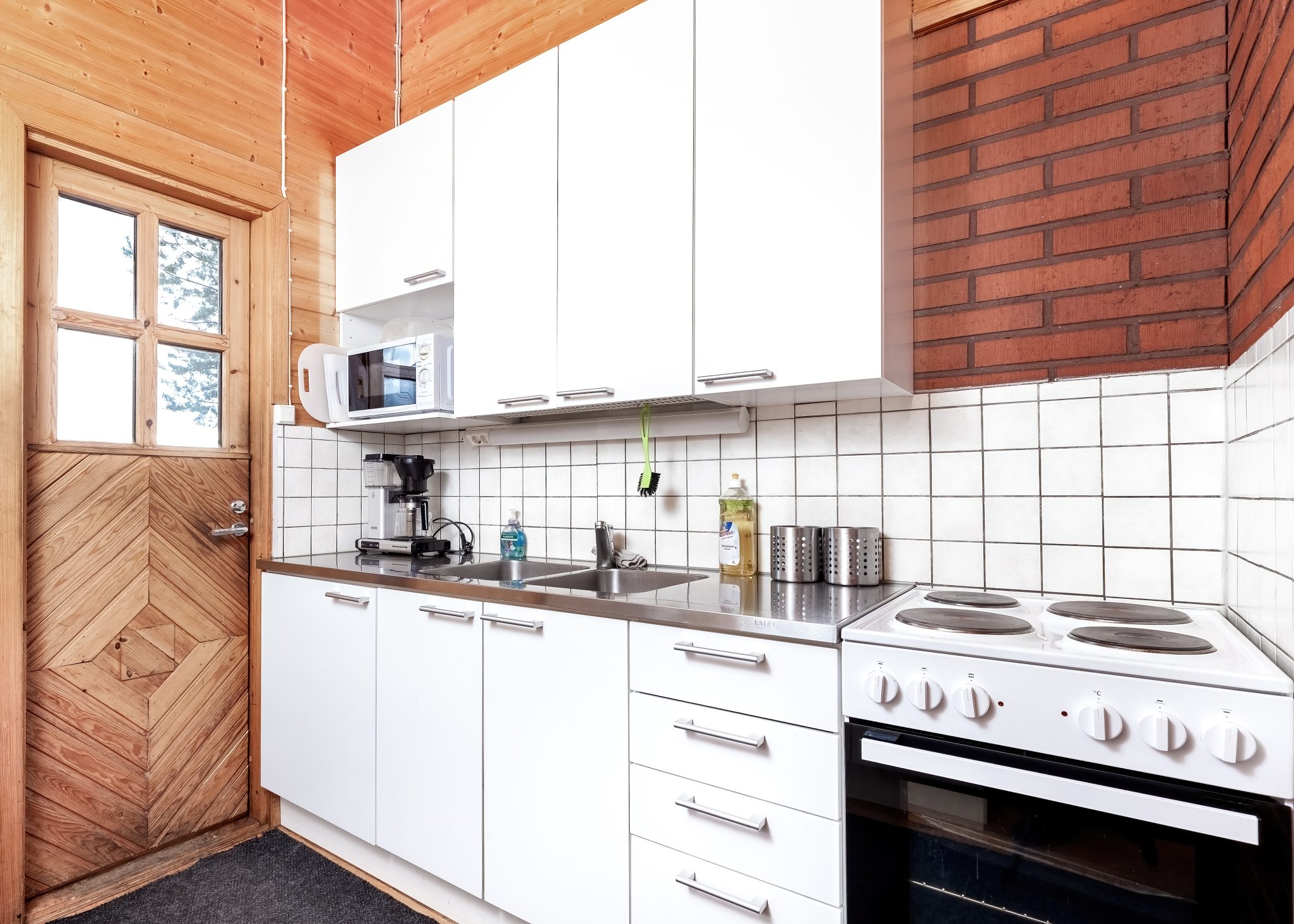 SAUNA AND TOILETS: The wood-heated lakeside sauna can accommodate up to 10 guests on its benches. Cold running well water is available from the tap, and you can heat the washing water using the wood-heated stove’s water heater. Two dry toilets are located in a separate building between the main building and the accommodation buildings.