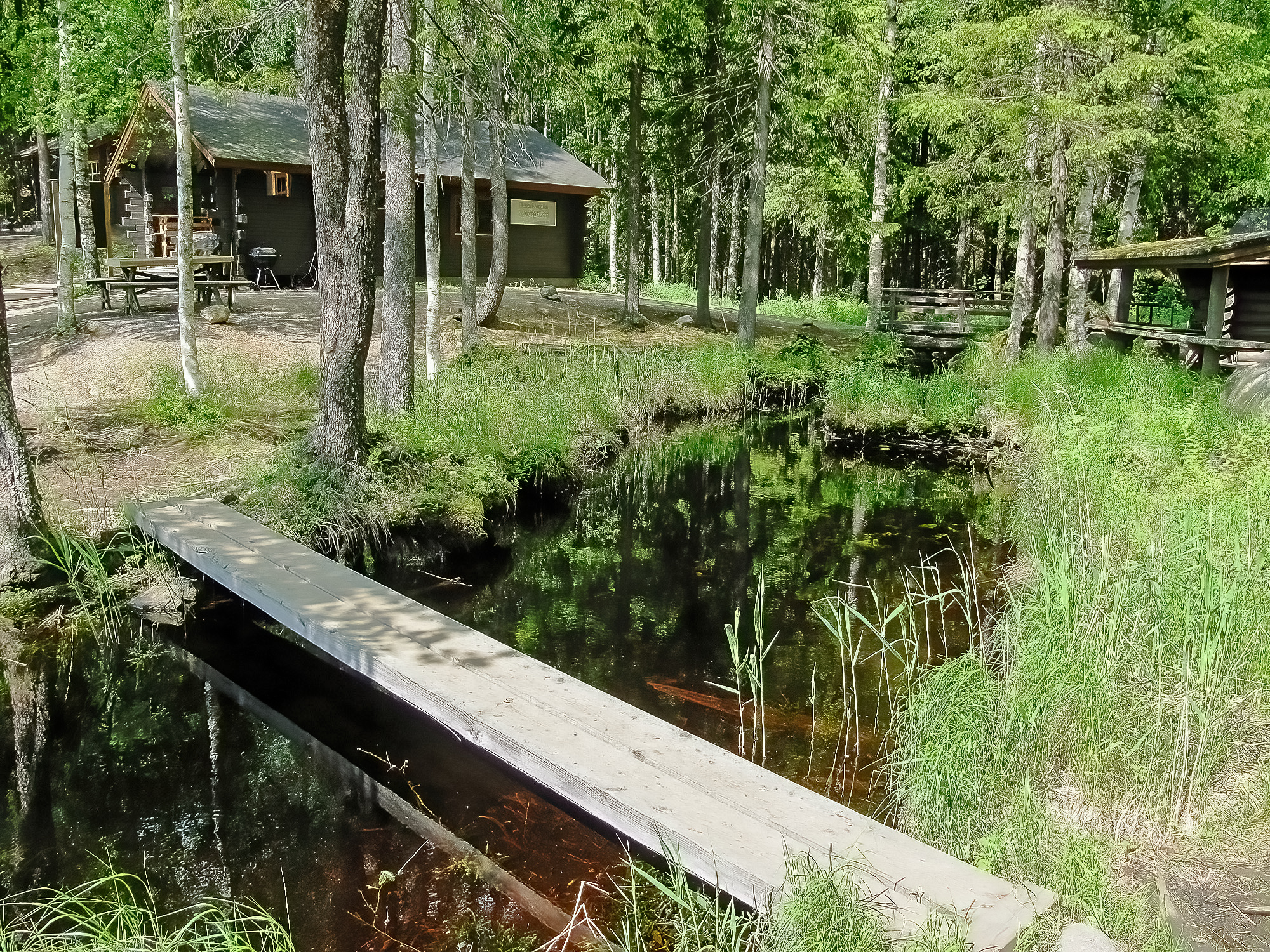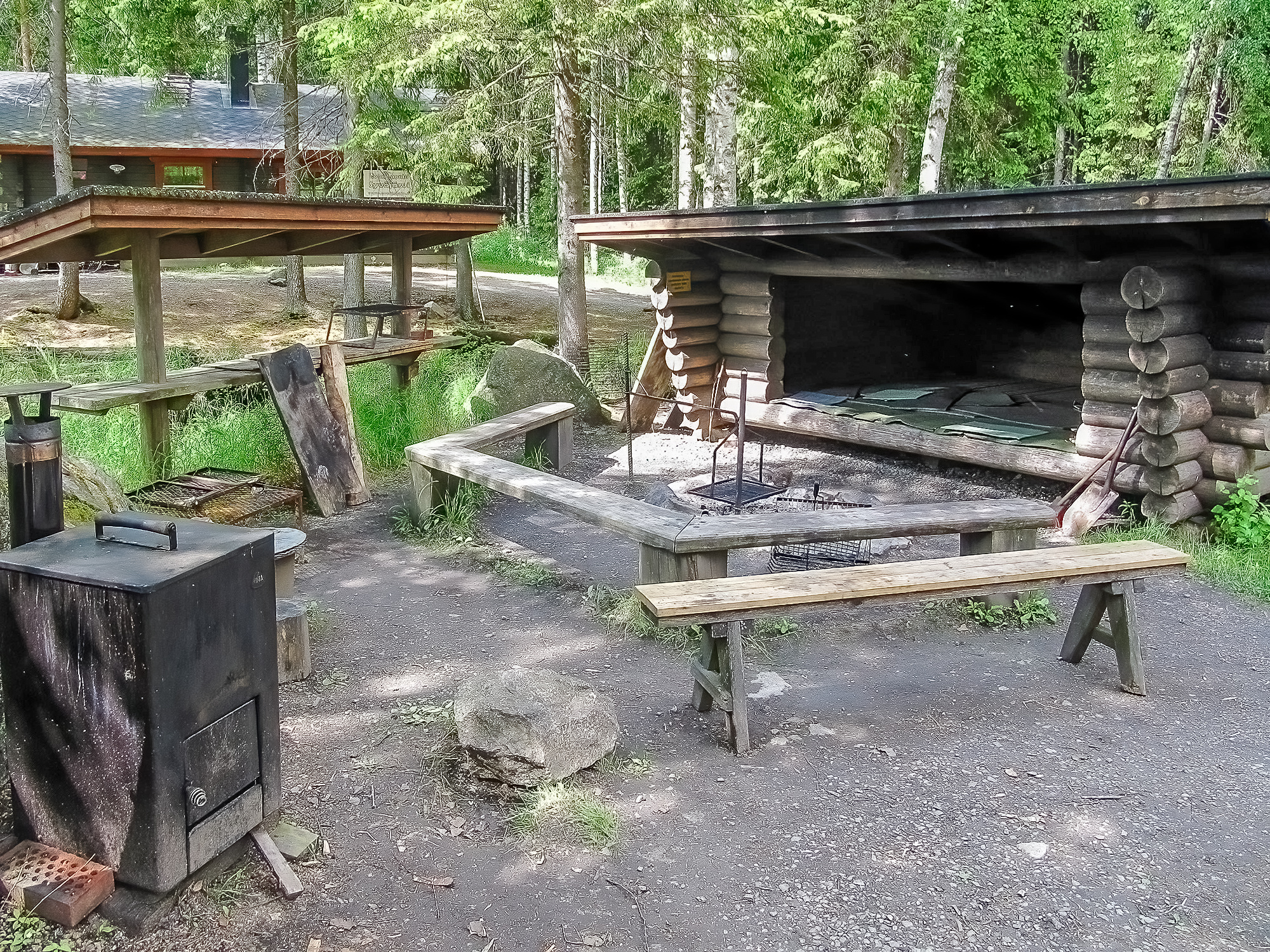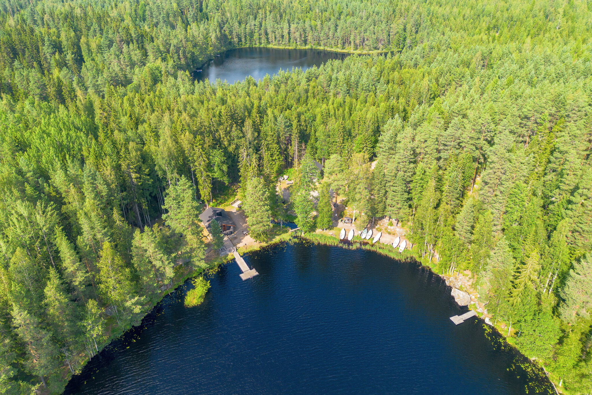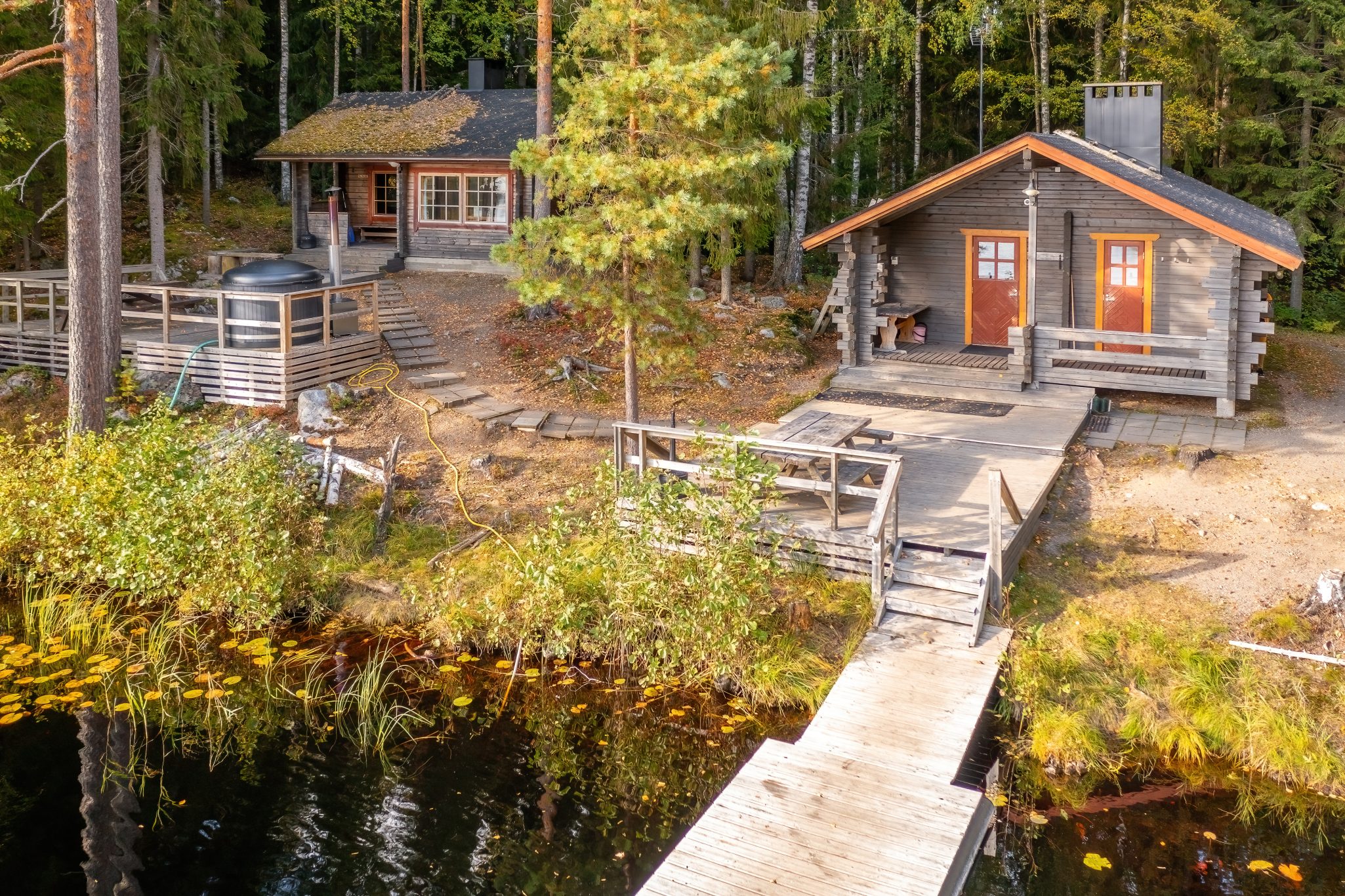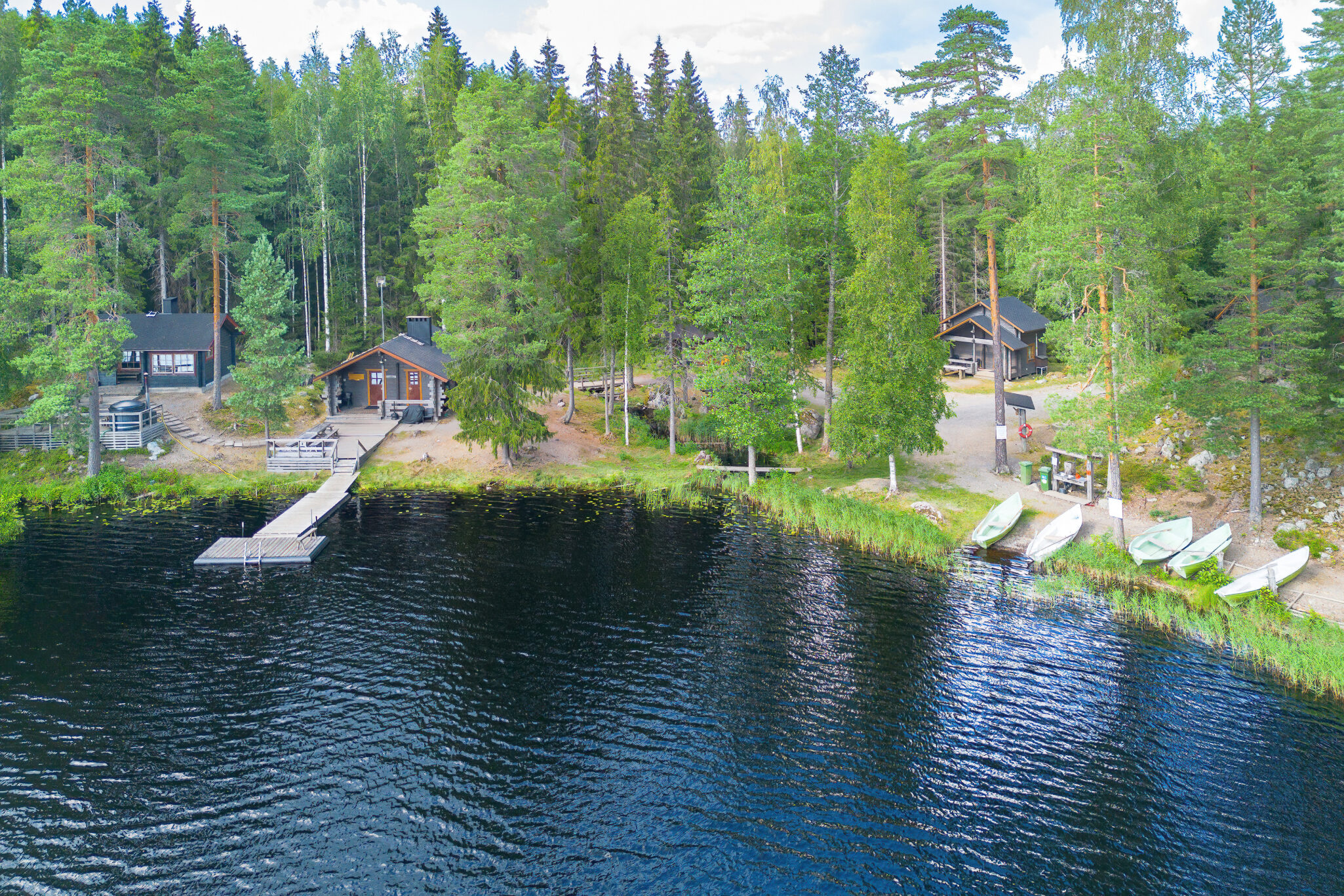OUTDOOR SPACES AND HOT TUB: In front of the main building, there is an open terrace with benches. The campfire spot and lean-to shelter are located in the middle of the complex, by the lake and the stream running through the area. There is also a fish processing area, 6 rowing boats, and 3 piers in the area. On the sauna terrace, there is a wood-heated hot tub that can accommodate approximately 6 bathers at the same time.