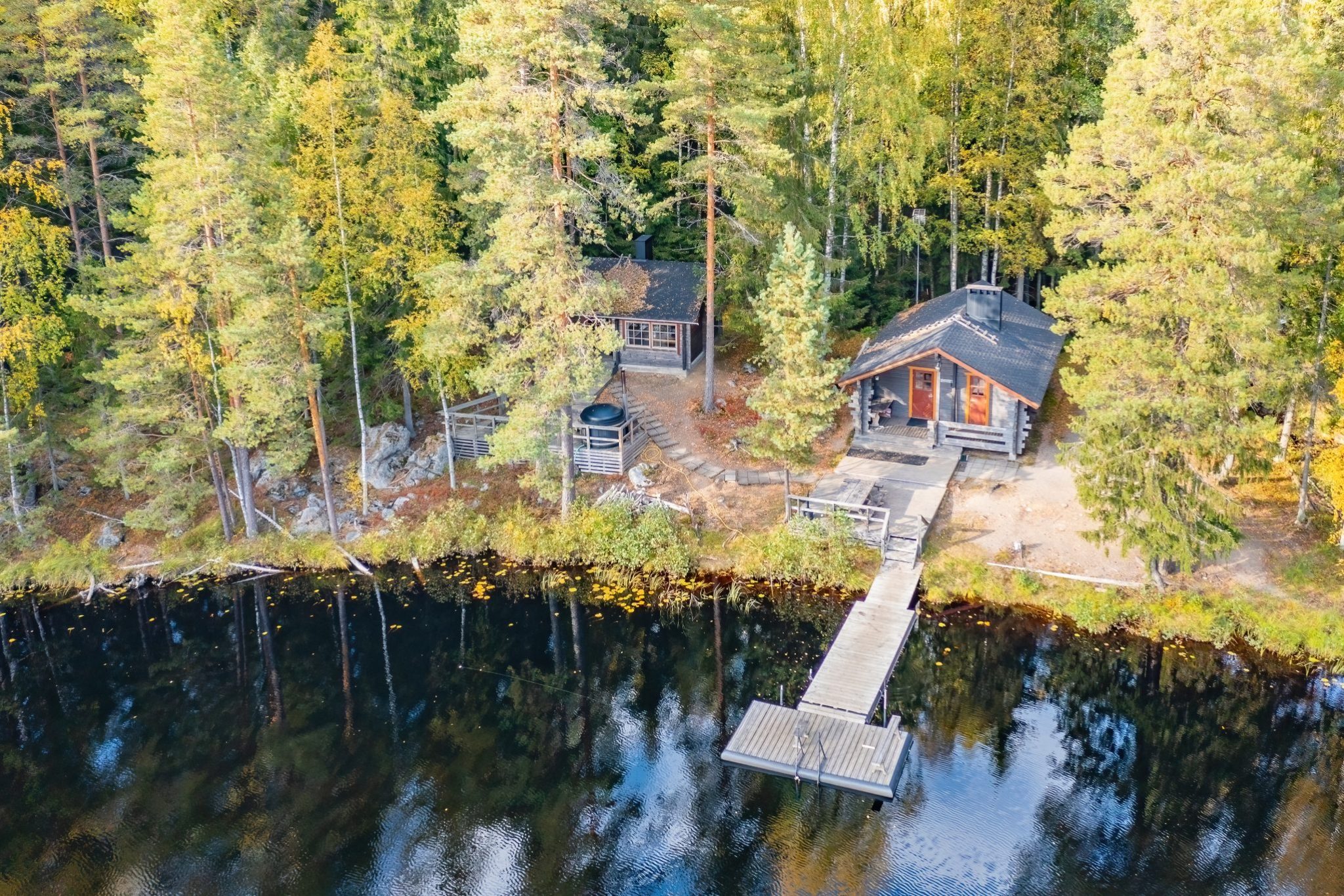 Do you also crave relaxation in hot tubs? Easily arranged. Sitting by the campfire in the lean-to shelter? No problem. Proper sauna sessions? Absolutely! There’s also a well-equipped kitchen for your culinary needs, and a campfire spot by the shore where you can barbecue your freshly caught rainbow trout.
