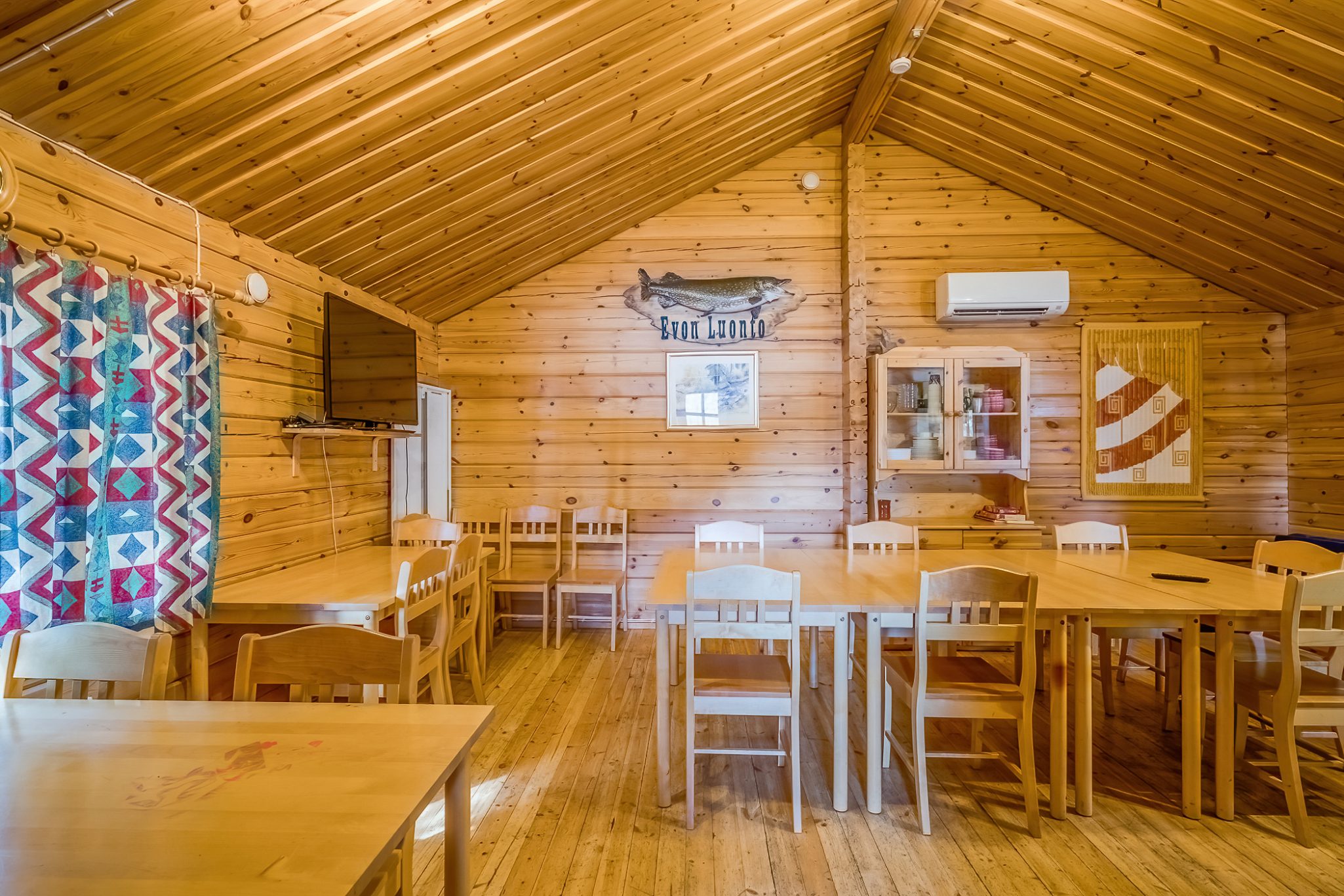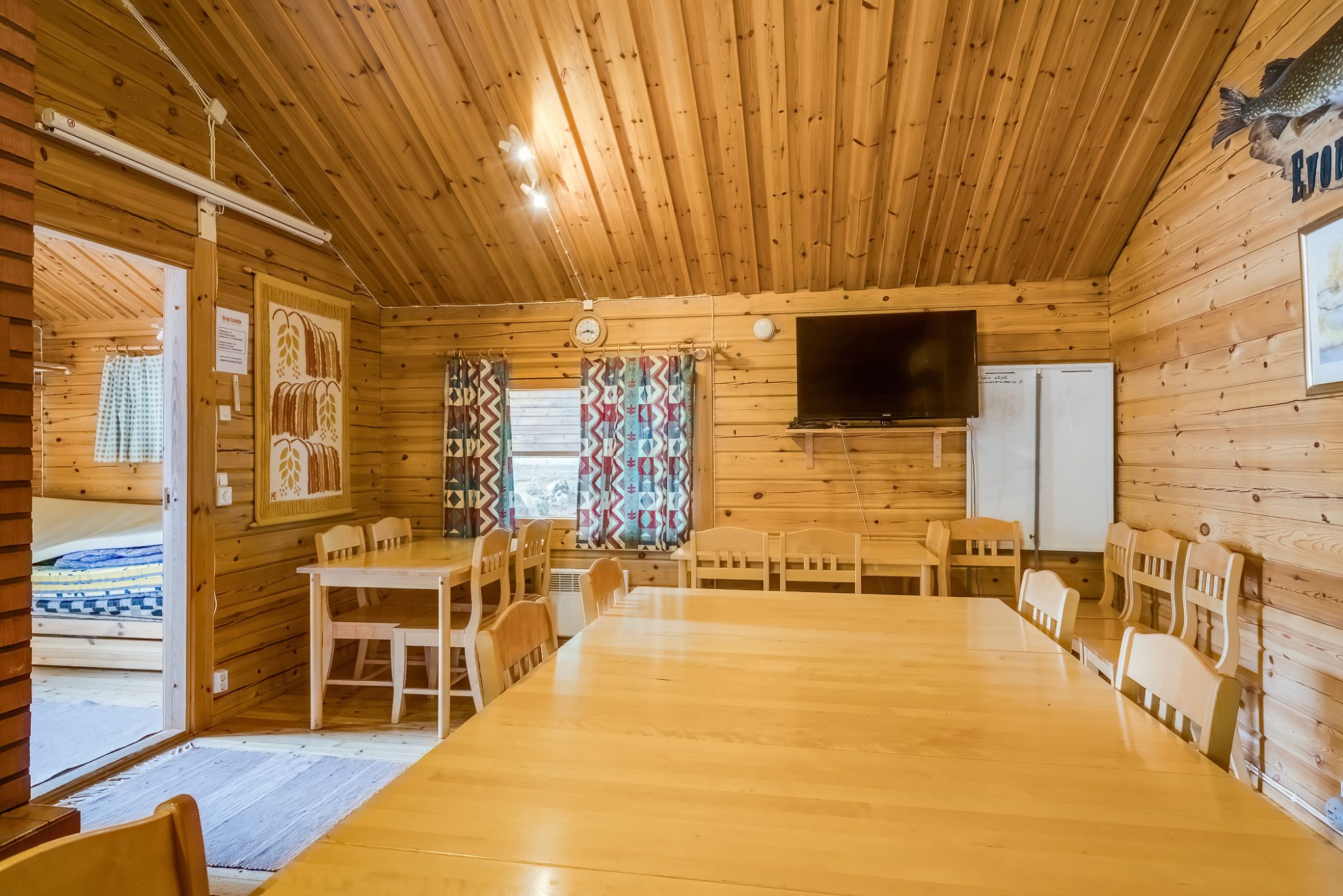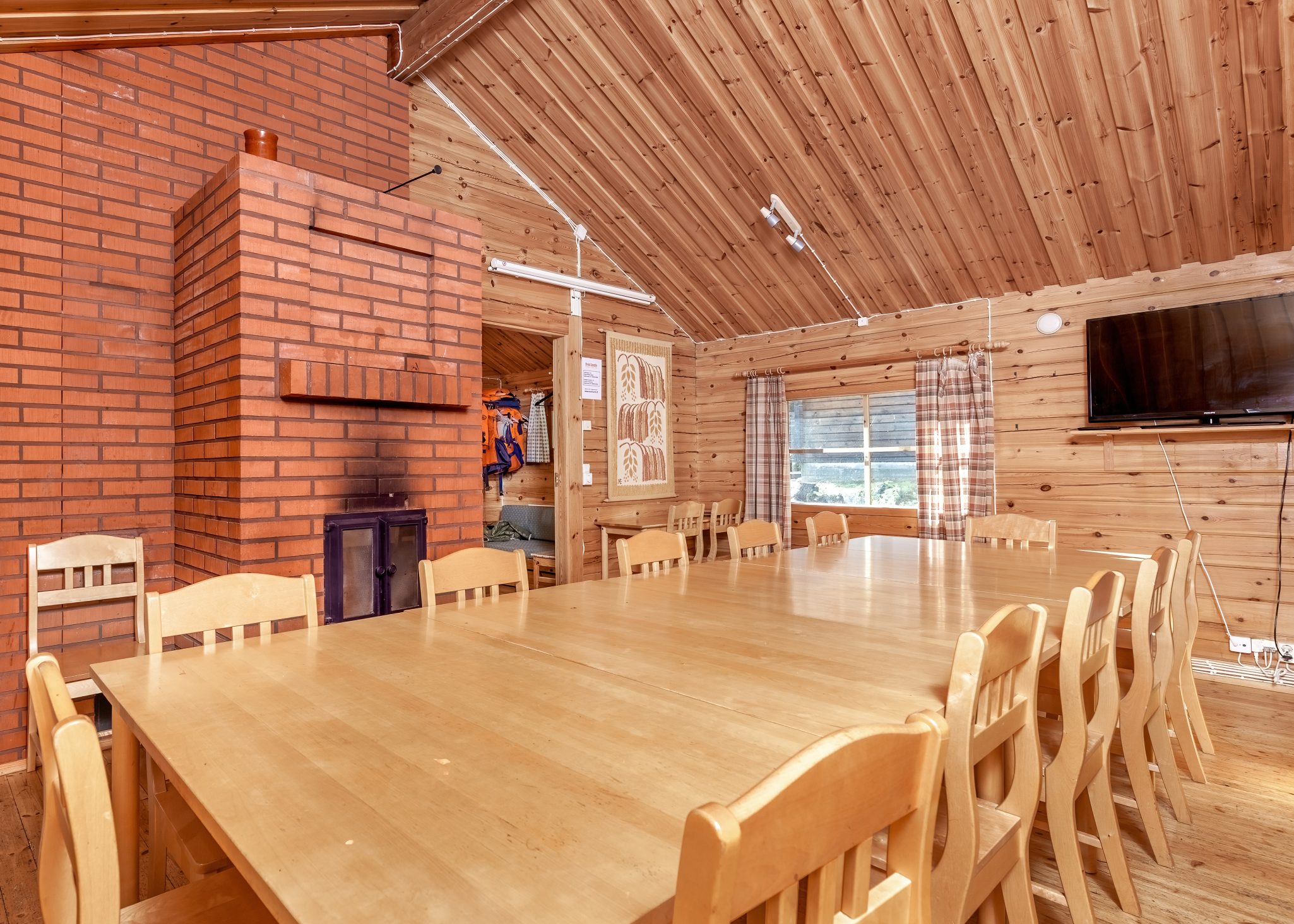 LOUNGE/CONFERENCE SPACES: The main building can accommodate approximately 20 people for dining, socialising, conferences, or family gatherings. It is equipped with a 42-inch flat-screen TV with computer connectivity. In the separate lakeside sauna building, there is a fireplace room with traditional Finnish furnishings, a fireplace, a sofa, and a refrigerator-freezer.