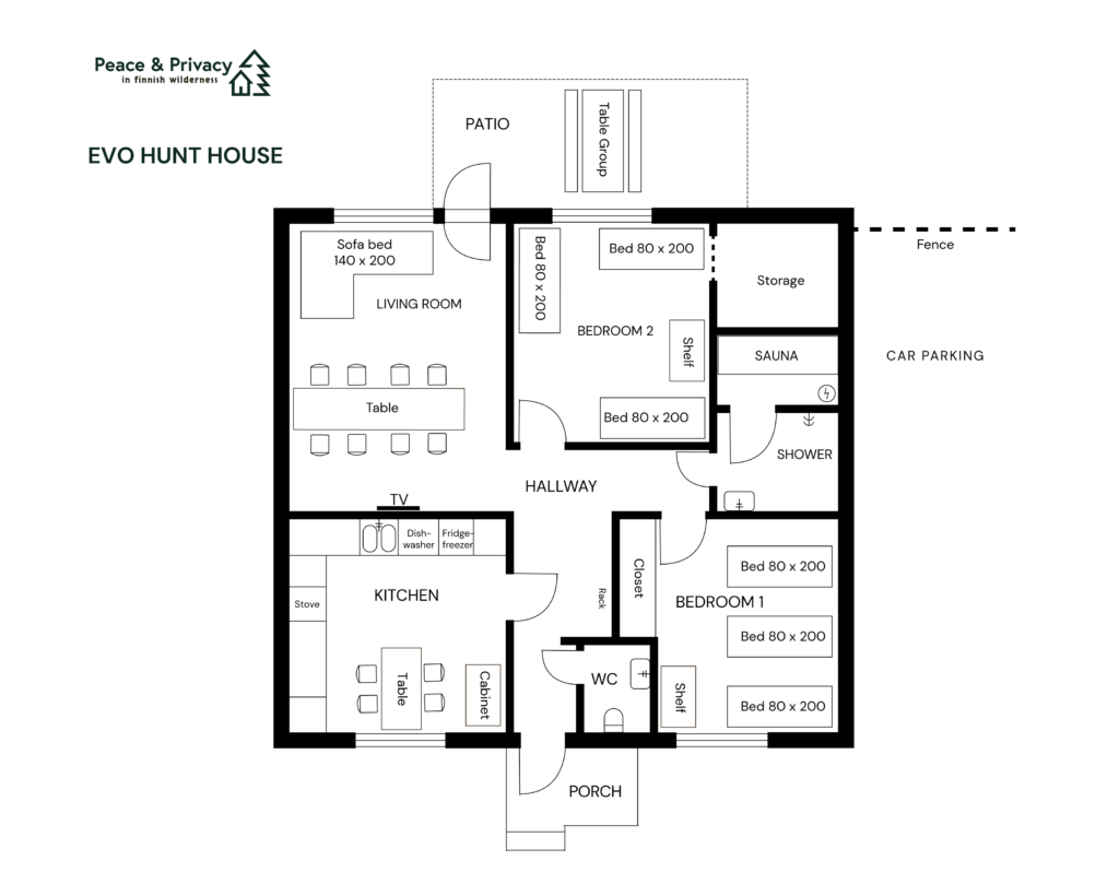 GENERAL INFORMATION: Located in the Evo Peace area in Hämeenlinna, Evo Twin consists of the Evo Hunt House and the Evo Lakeside Villa. The whole complex is suitable for private individuals and businesses for events, parties, workplace health promotion, conferences, accommodation, and holidays in the heart of nature. Additionally, you can complement the experience with the nearby Evo Wilderness Barn, which serves as an event and party venue during the warmer seasons.