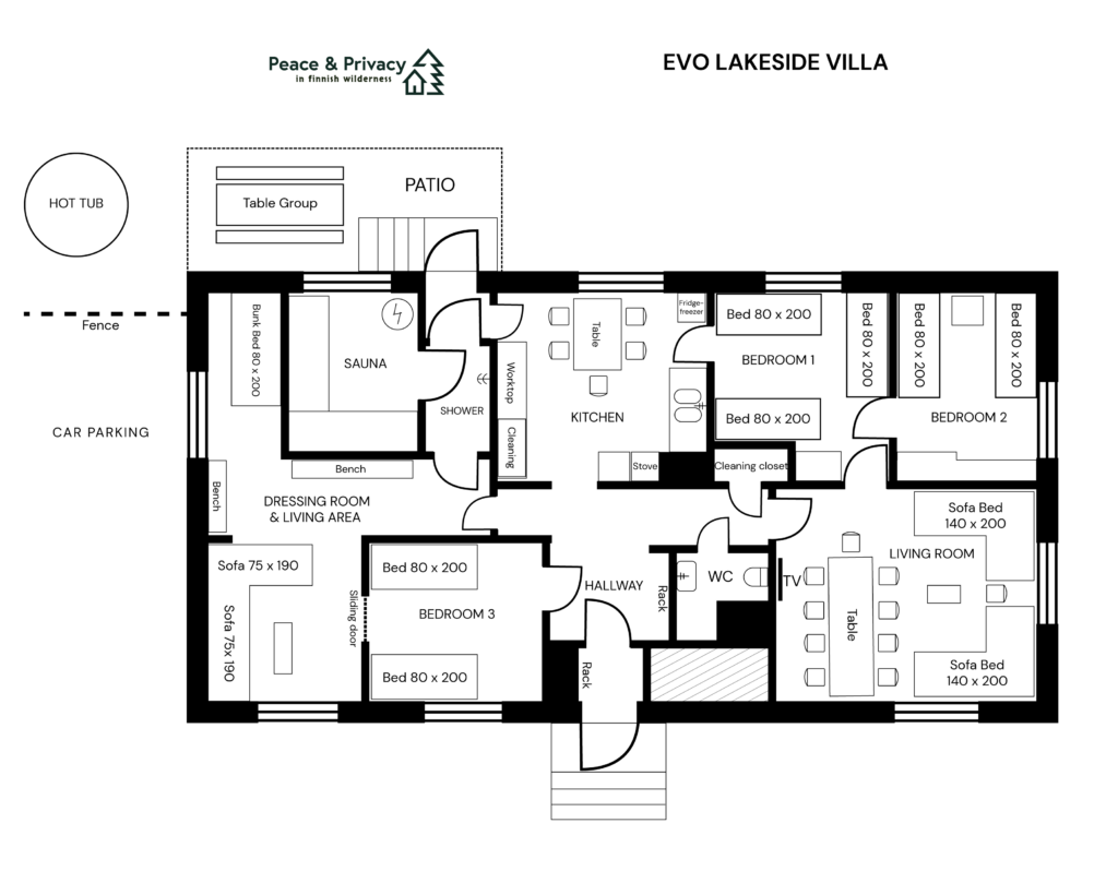 PRICES: The booking price includes the facilities of both Evo Twin villas as well as the use of the saunas. As additional services, you can book the lean-to shelter and outdoor fireplace, the Evo Wilderness Barn, hot tub, final cleaning, bed linens ready-made or provided separately, and towels. We also offer programme services, catering services, and work services such as preparing the saunas and hot tubs before guests arrive. All additional services should be ordered at least 14 days before arrival.
