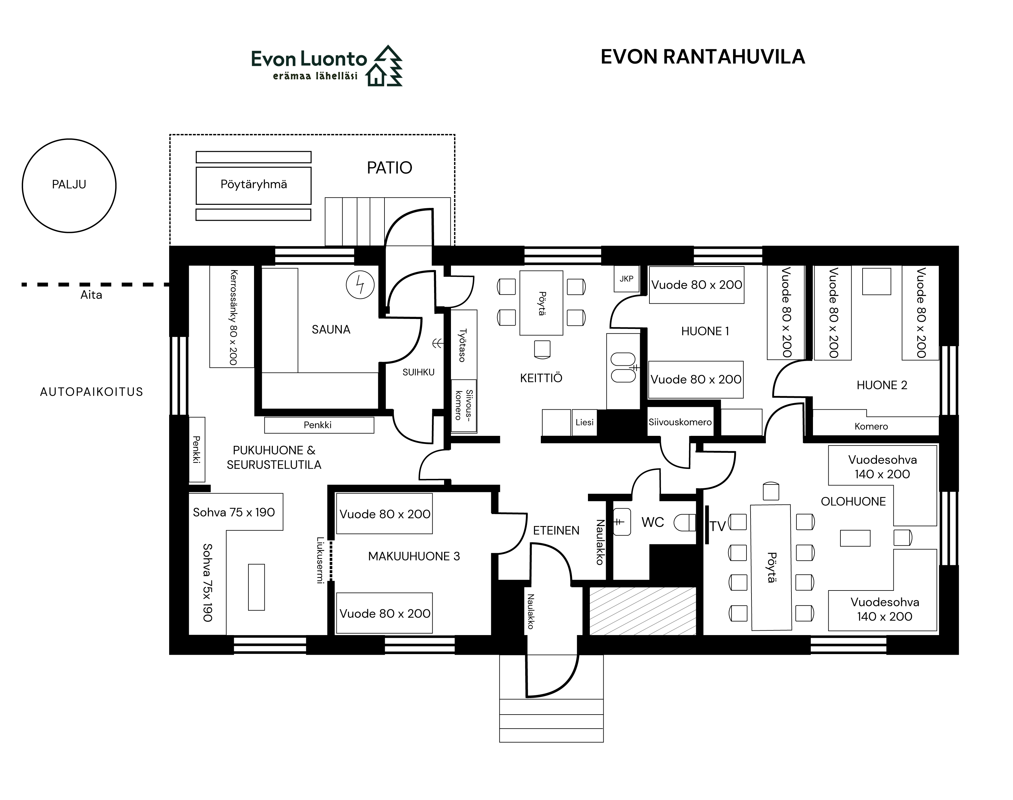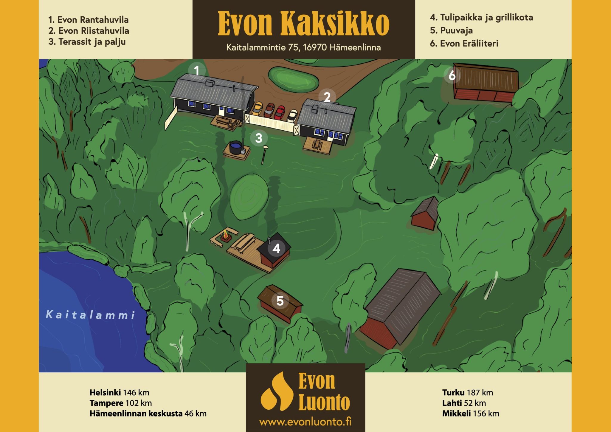 YLEISTÄ: Hämeenlinnassa Evon Rauhan alueella sijaitseva Evon Kaksikko koostuu Evon Riistahuvilasta ja Evon Rantahuvilasta. Kokonaisuus soveltuu yksityisille ja yrityksille tapahtumiin, juhliin, tyky-päiviin, kokouksiin, majoitukseen sekä mökkeilyyn luonnon äärellä. Kokonaisuutta voi täydentää lisäksi alueella sijaitsevalla Eräliiterillä, joka sopii tapahtumien ja suurtenkin juhlien pitopaikaksi lämpiminä vuodenaikoina.