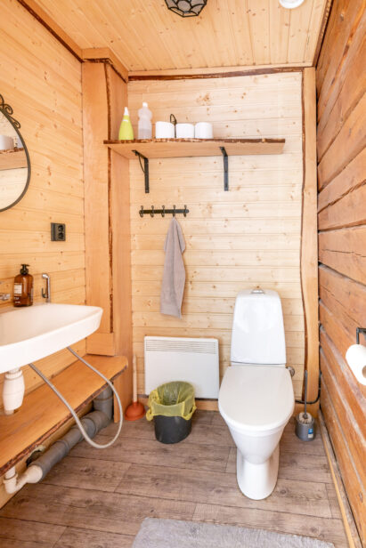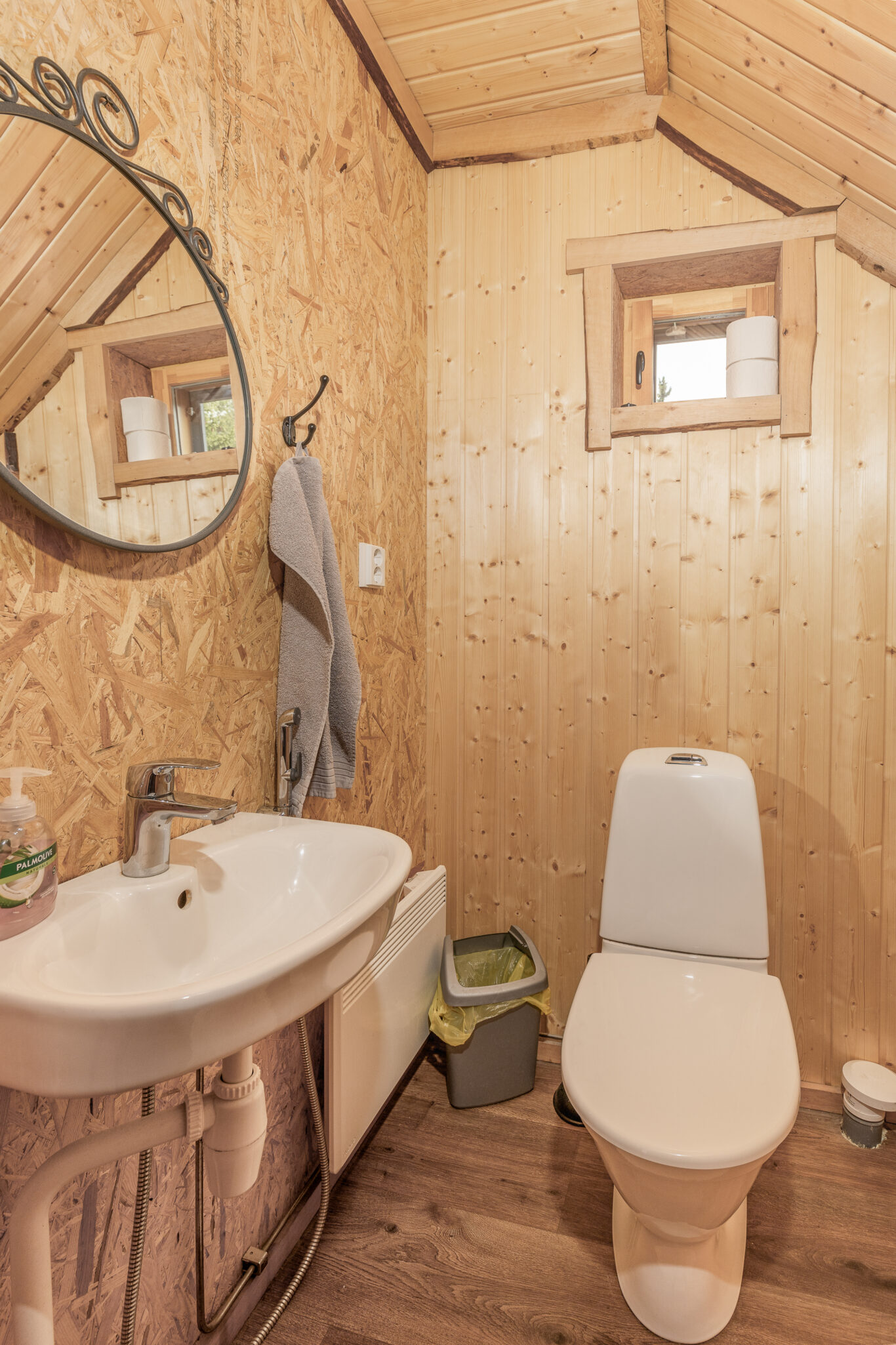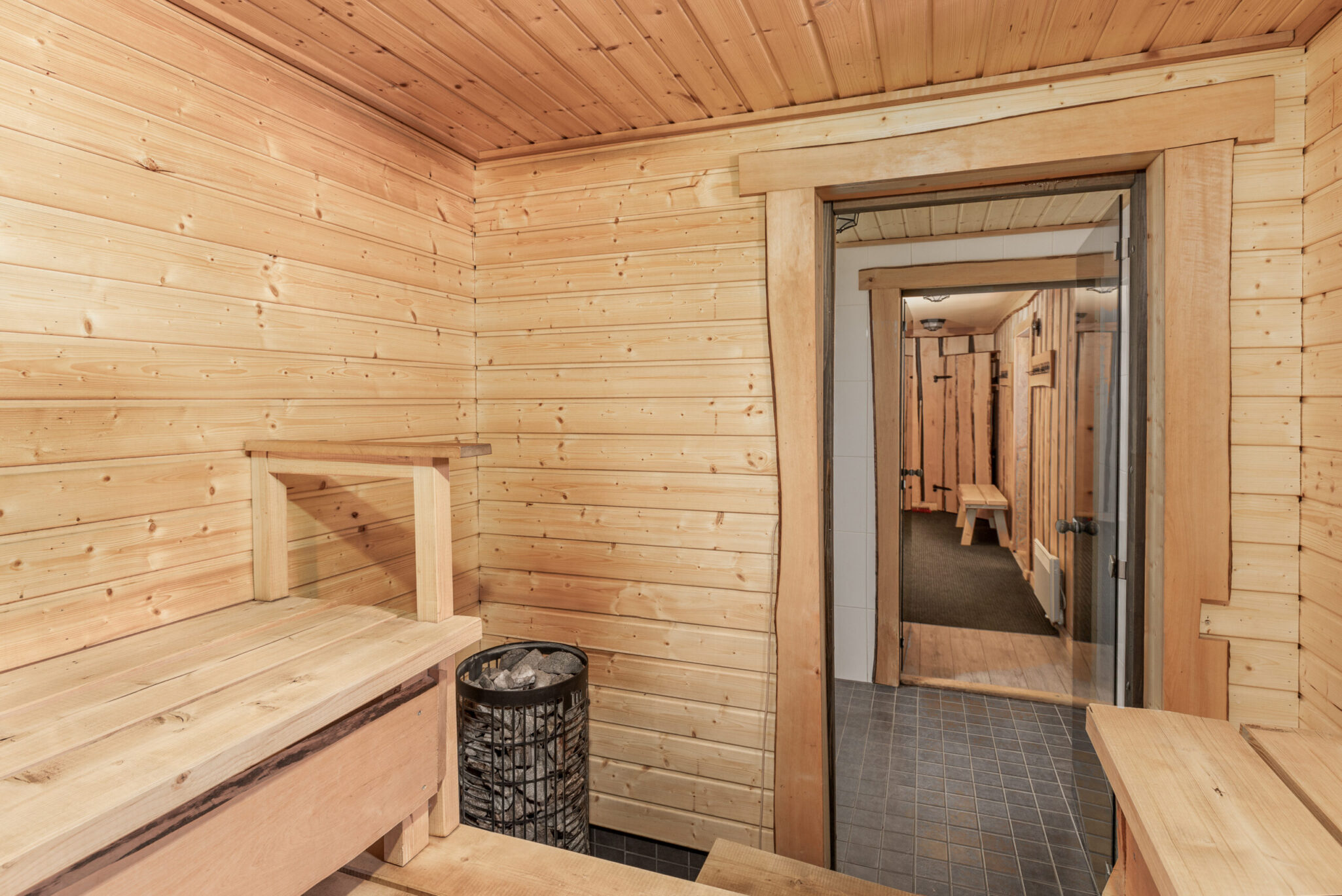 SAUNAS, SHOWERS, AND TOILETS: The electric-heated indoor sauna can accommodate 6–8 people at a time on its benches. The shower room is equipped with a shower, and there is direct access from the dressing room to the terrace for cooling off. There are 2 toilets in the main building, one on the ground floor and one on the upper floor.