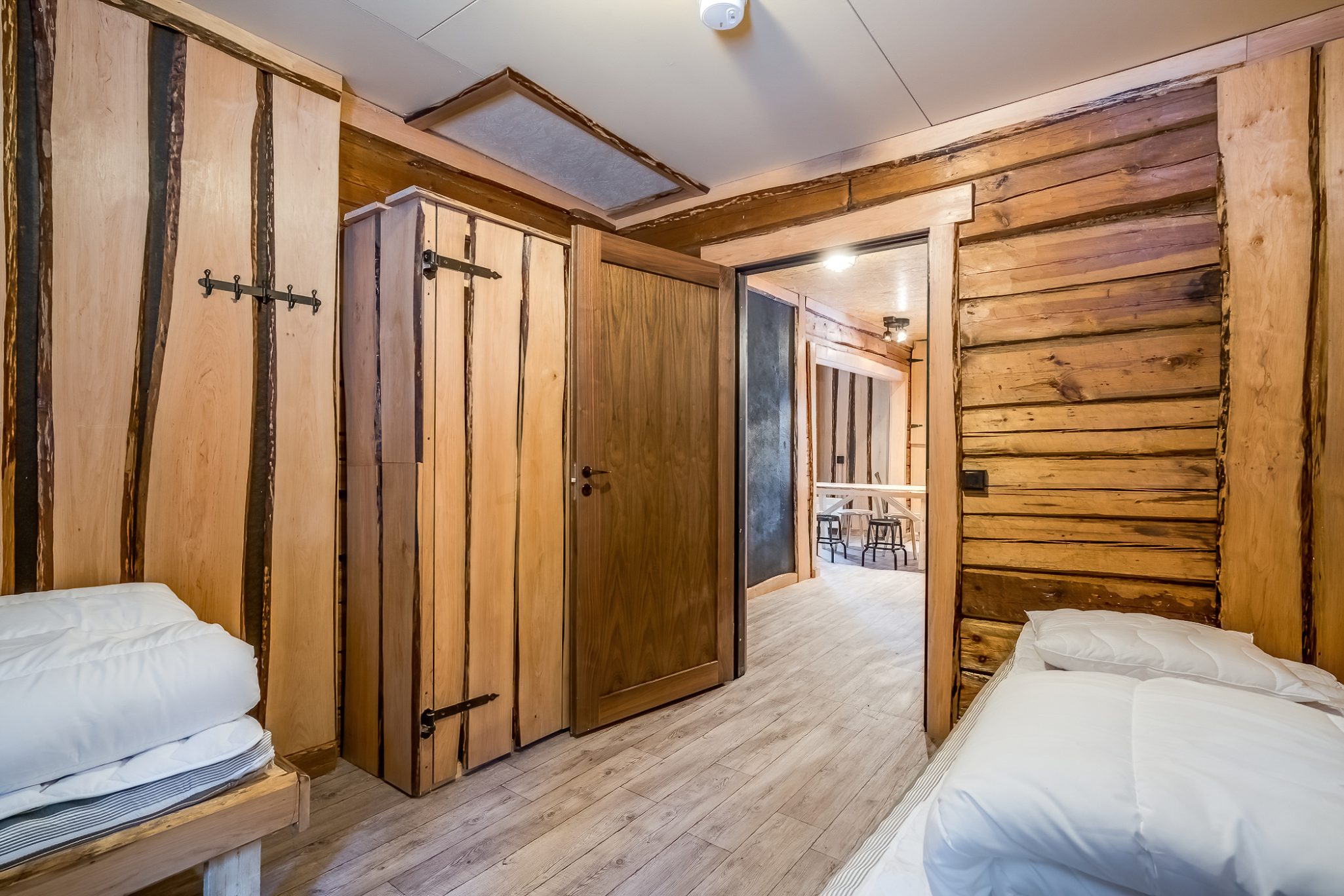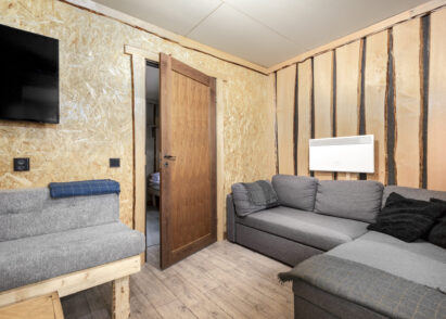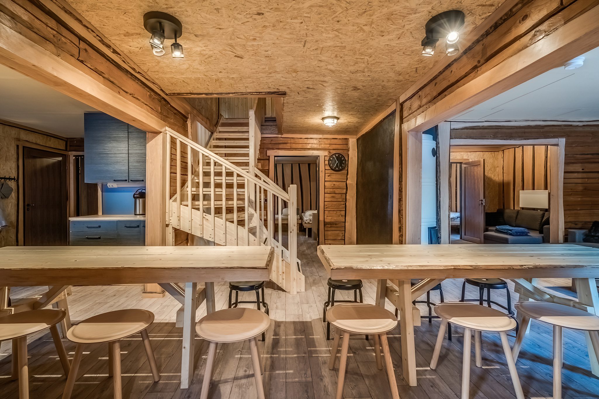 The long table and the bar counter in the main hall can accommodate about twenty guests for conferences, dining, or toasting. The space continues into a more intimate lounge, serving as headquarters for both evening gatherings and group activities. At the end of the day, you can either unwind on the terrace in hot tubs or in the heat of the solid log backyard sauna – exactly as you prefer.