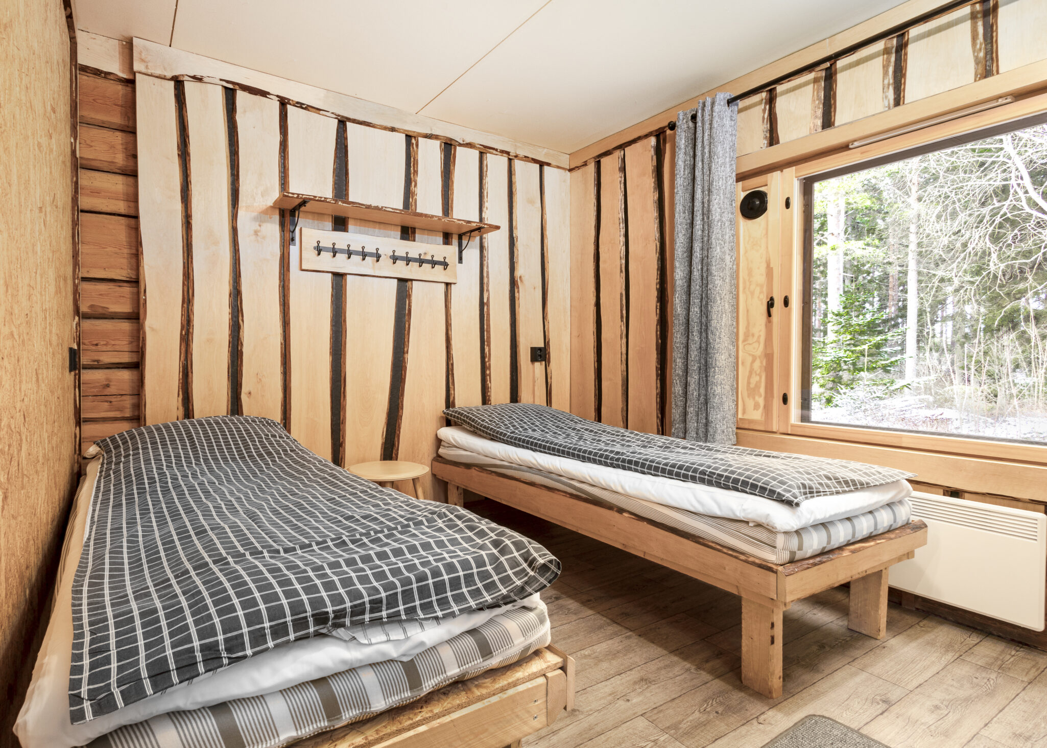 OUTDOOR FACILITIES AND HOT TUBS: The covered terrace of the cabin has dining tables for nearly 20 guests, and in addition, there is a wilderness-themed terrace group in the forest garden. The lean-to is located in the heart of the forest garden, between the main building’s terrace and the yard sauna. One of the hot tubs is situated on its own terrace next to the yard sauna, and the other is next to the main building’s terrace. Both hot tubs can accommodate up to 6 people.