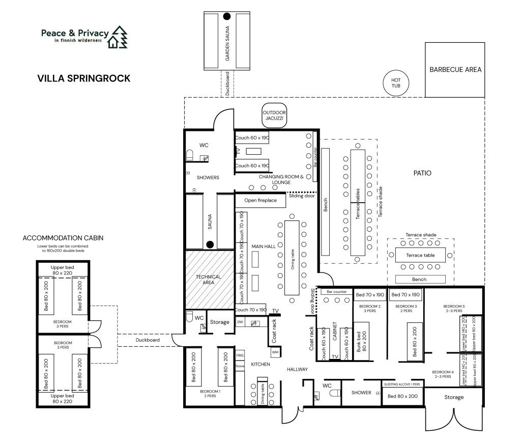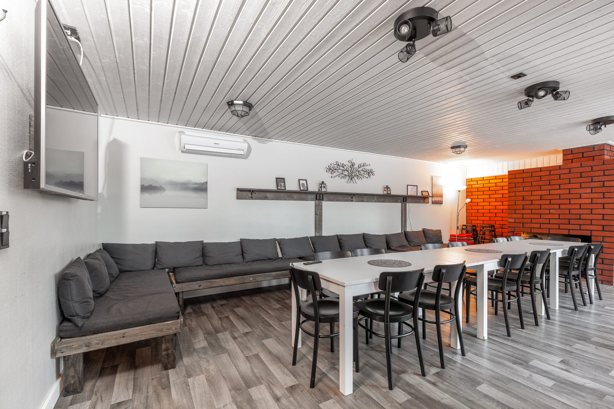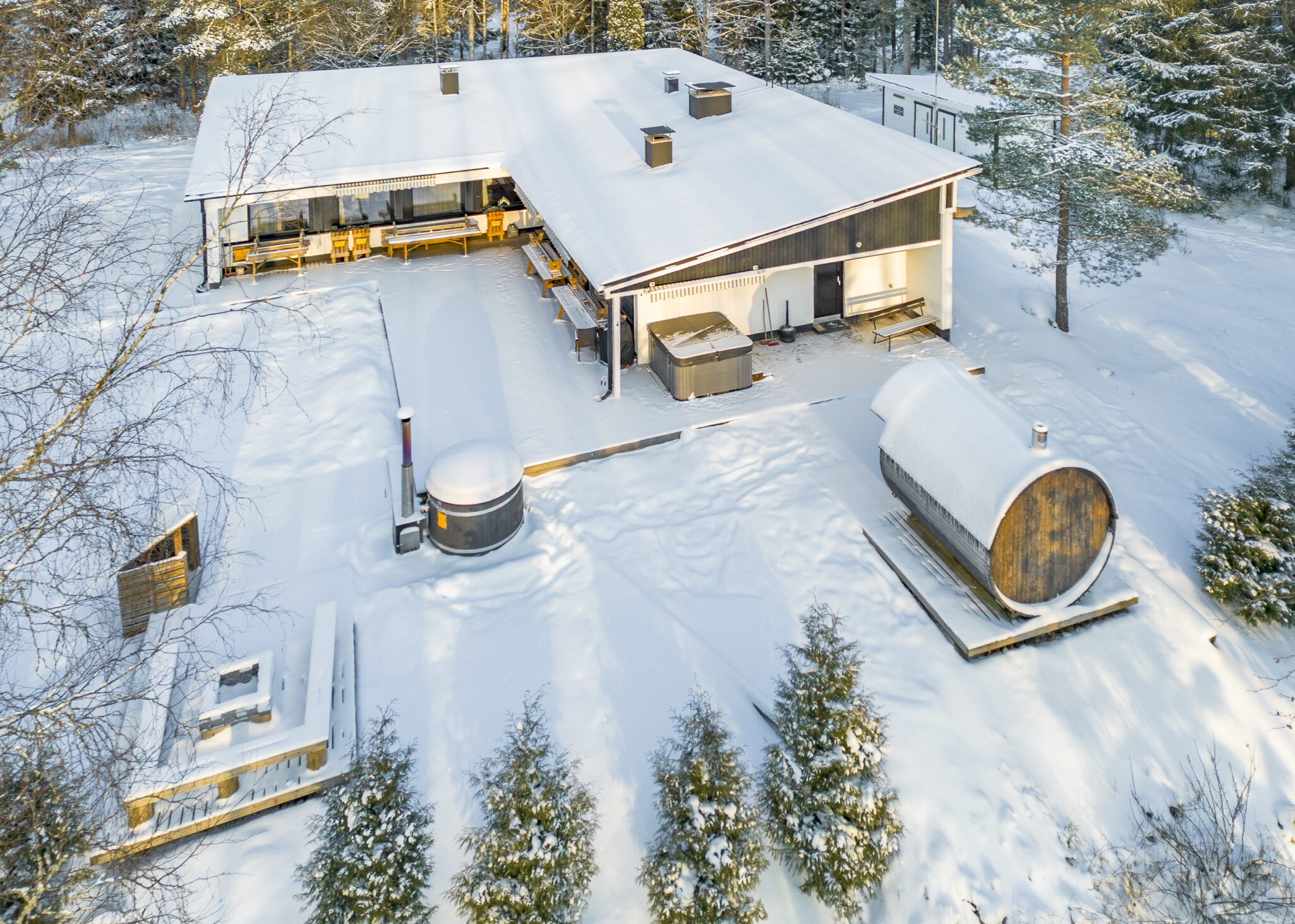 PRICES: The basic booking price of the villa includes the approximately 220 square metres of multi-purpose villa space and the sauna area. As an additional service, it is possible to book the barrel sauna, outdoor jacuzzi, hot tub, barbecue spot, game room, final cleaning, bed linens pre-made or provided separately, and towels. We also offer programme services, catering services, and work services such as preparing the wood-heated sauna and hot tub before guests arrive. All additional services should be booked at least 14 days before arrival.