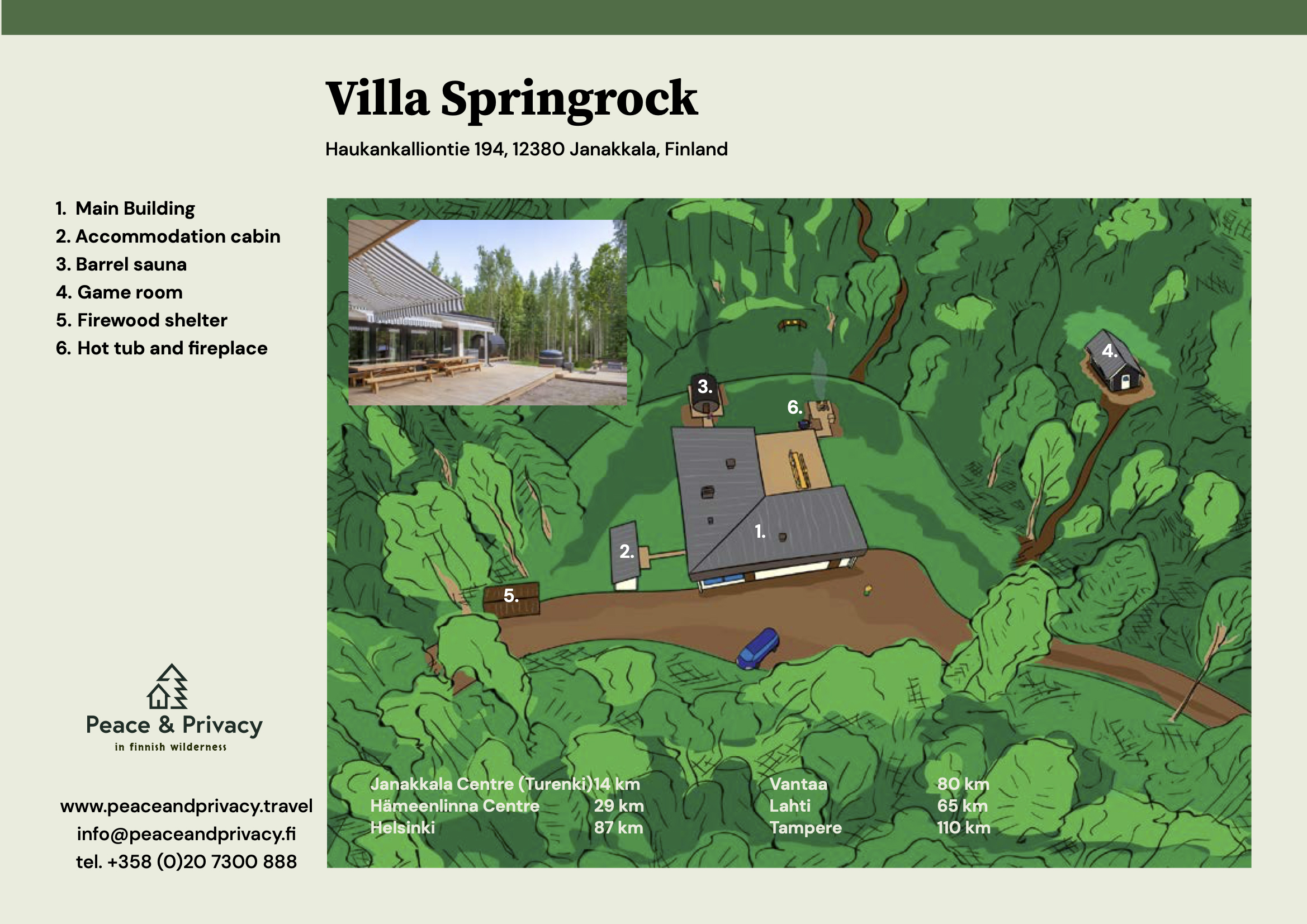 Villa Springrock is close by yet far away. This solid, highly valued brick building is located almost at the demographic centre of Finland, just a 1-1.5-hour drive away from the centres of Southern Finland.